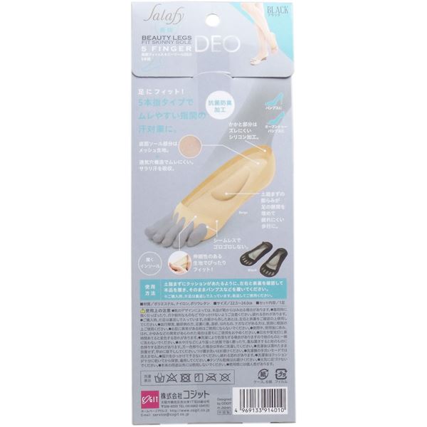 美脚フィットスキニーソール DEO 5本指 ブラック 1足入●足にフィットして疲れにくいクッション一体型フットカバー●底面ソール部分はメッシュ生地でムレにくく、汗を吸収●シームレスでゴロゴロせず、伸縮性のある生地が足にピッタリフィット!●5本指タイプでムレやすい指間の汗対策に●サイズ:22.5ー24.0cm【使用方法】・土踏まずにクッションがあたるように、左右と表裏を確認して本品を履き、そのままパンプスなどを履いてください。