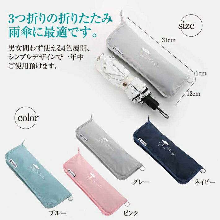 ▼こちらもおすすめ! 【傘ケース 38x12cm】 【レインスニーカー】 【ヒール用レインカバー】 【自転車カバー】商品詳細 商品名 傘ケース 折りたたみ 傘 カバー ラウンドファスナー 31x12cm ブルー ピンク グレー ネイビー/傘カバー 31x12 商品説明 折りたたみ傘についている傘カバーって意外と仕舞いにくい… もちろん水滴も吸収してくれないからカバンの中が濡れてしまう事もあったり… そんな事も解消してくれる傘ケースです。